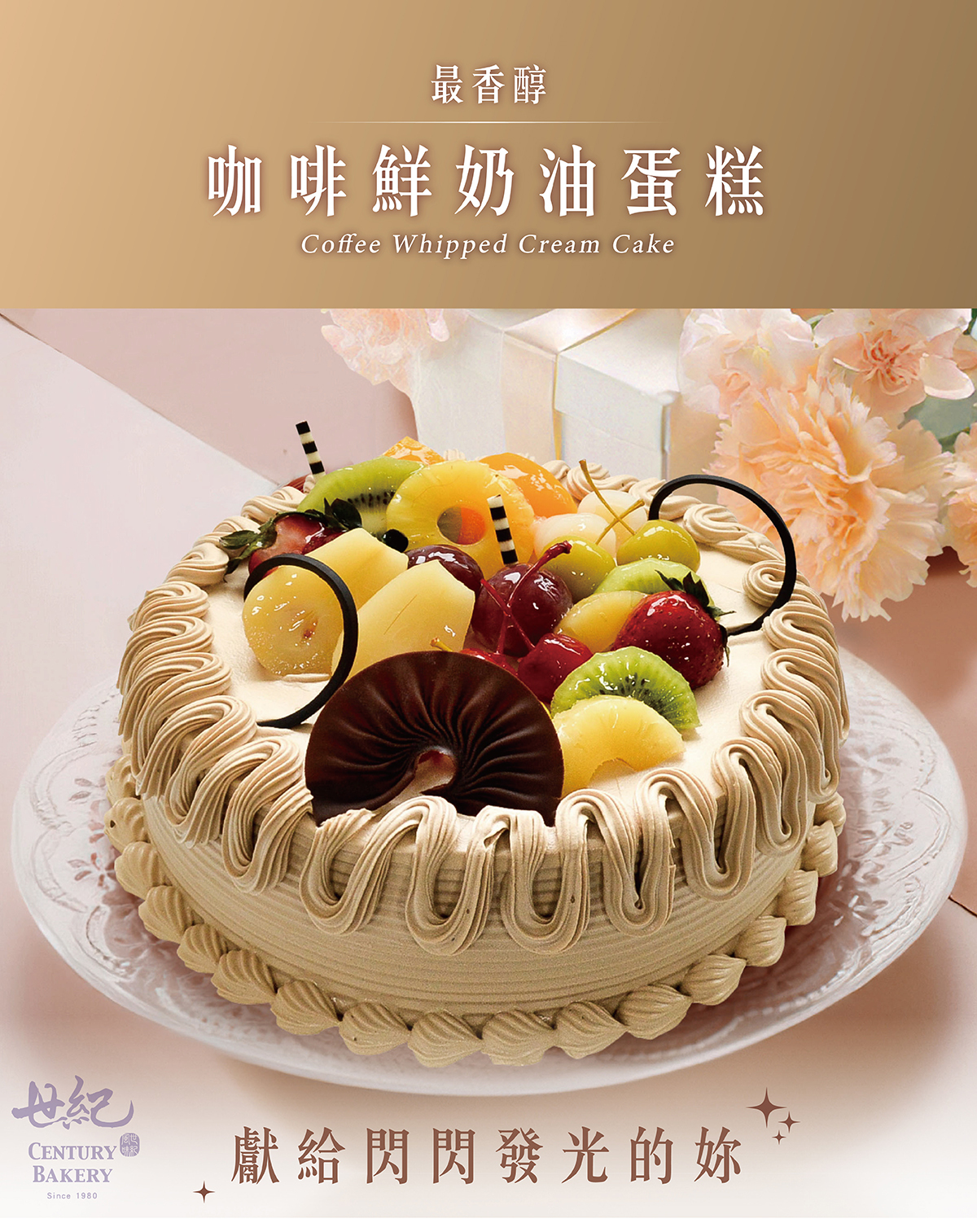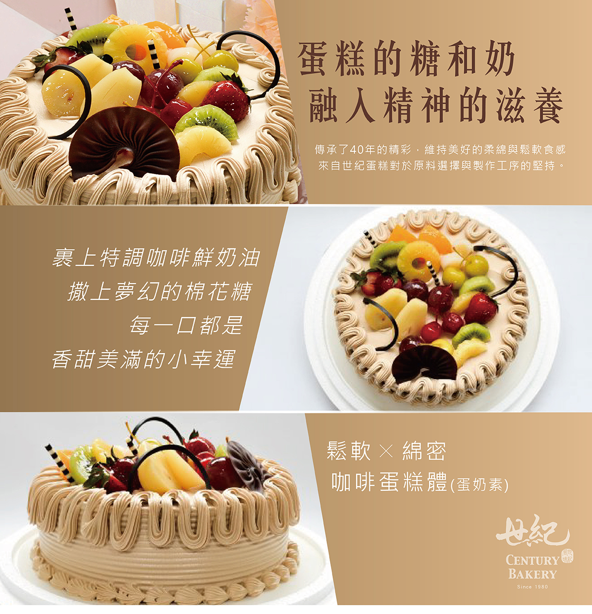 世紀糕點特製的醇香咖啡蛋糕,特製的咖啡蛋糕體,香醇可口。裹上特調咖啡鮮奶油,撒上夢幻感十足的棉花糖,每一口都是香甜美滿的小幸運。